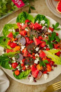 Na talerzu układamy liście sałaty rzymskiej. Dodajemy ziemniaki, cząstki grejpfruta, przekrojone pomidorki cherry i pestki granatu.