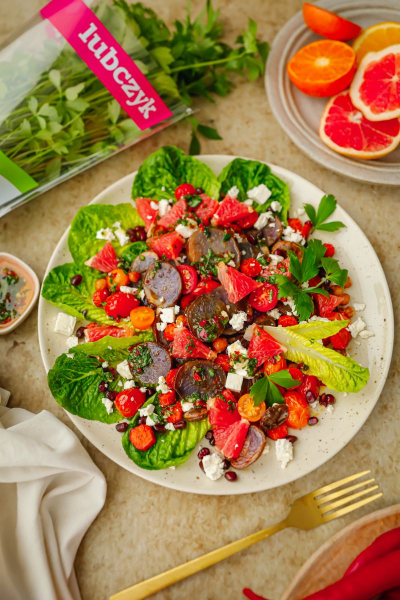Sałatka z fioletowymi ziemniakami, grejpfrutem i lubczykiem